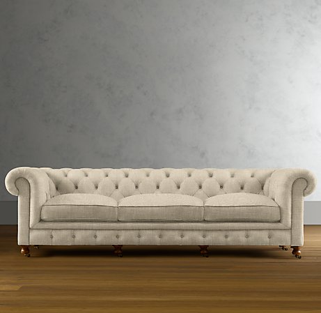 We ordered the Kensington Upholstered Grand Sofa from Restoration Hardware which had a price tag of $3635.00. I know, I know you don't need to tell me it is a ton of money but it was exactly what I was looking for. My requirements were a stone colored sofa that did not look dark brown. Tufted back and at least 3 cushions.