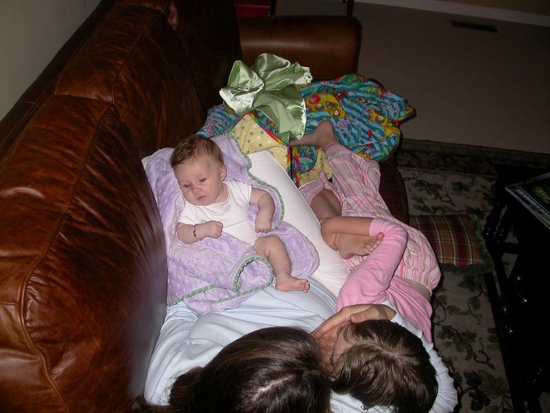 She was probably the most overwhelmed she has ever been in her life. Above is a common position with all three girls sleeping on top of her. Jeff must have come home from work once and found us like this. (you can see Caroline's feet popping out but she is covered by the blankets. How sad that Sally Jane is awake and was probably awake thinking "someone take care of me!"