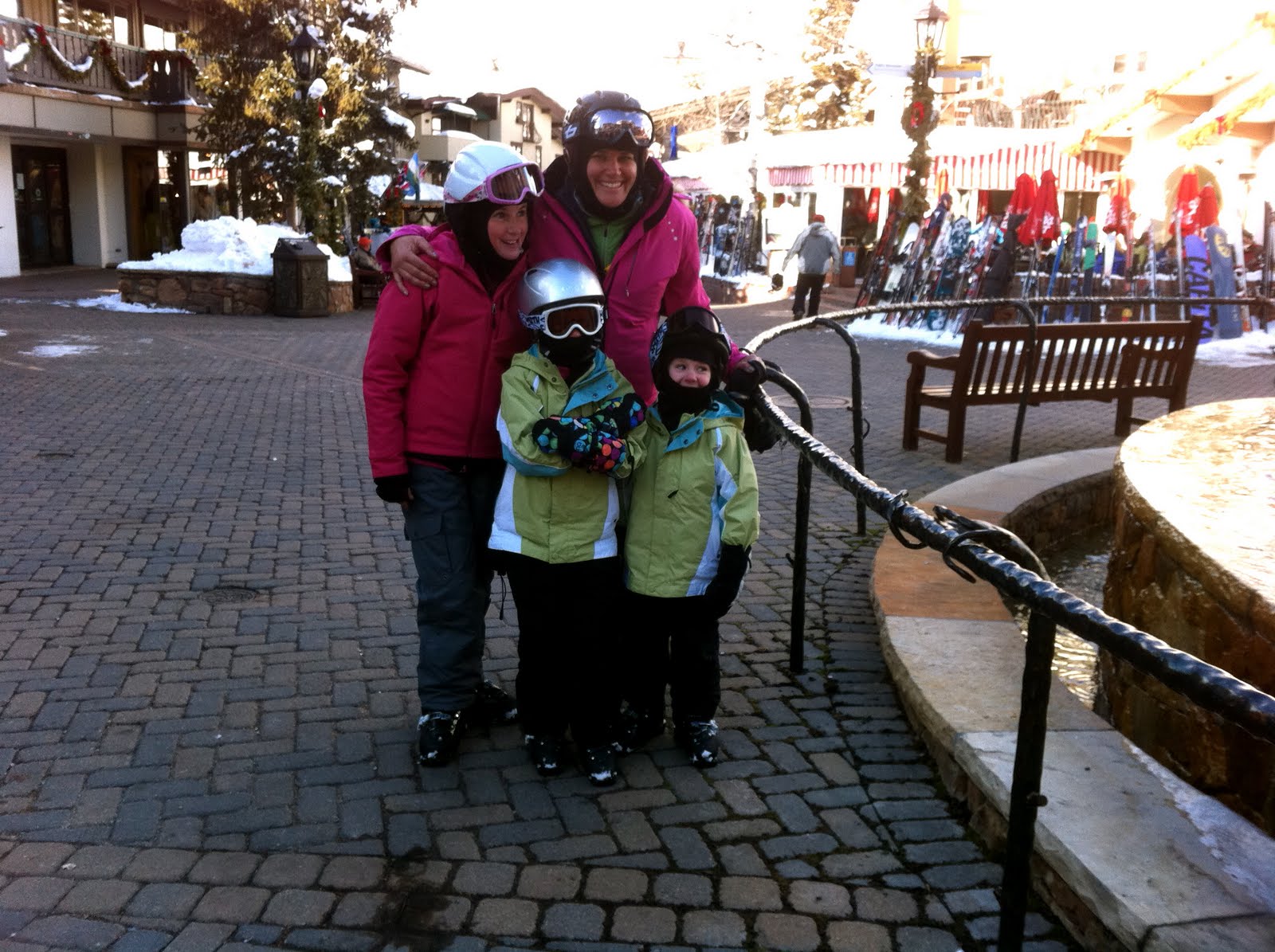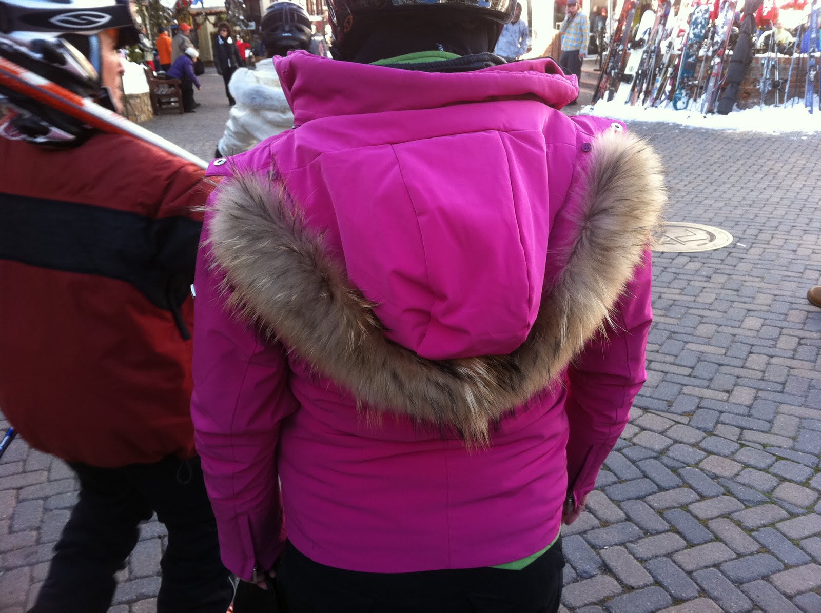 Jeff told me I would see a lot of fur at Vail. I so far have seen 1 man with a full length fur coat, 2 women and lots and lots of those fur head wraps. (it kind of makes me want one) So it seemed appropriate to zip on my fur hood to my fabulous pink jacket that Jeff gave me for Christmas (I am so not worthy of this great coat).
