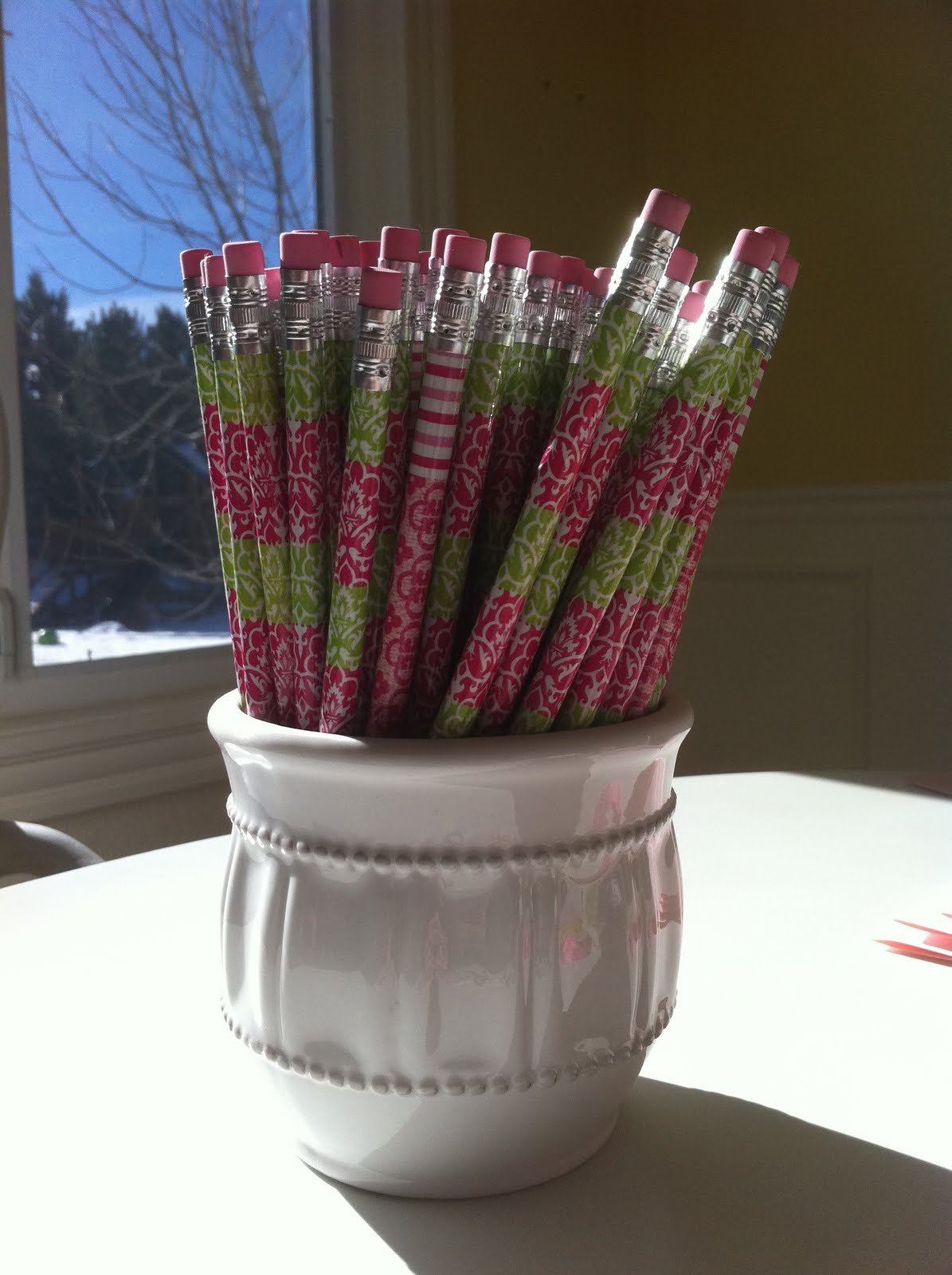 When I found these Pink and Green pencils in the Dollar section at the craft store I knew I could solve 2 problems. One, fill the corner of my desk and two make homework a whole lot easier.